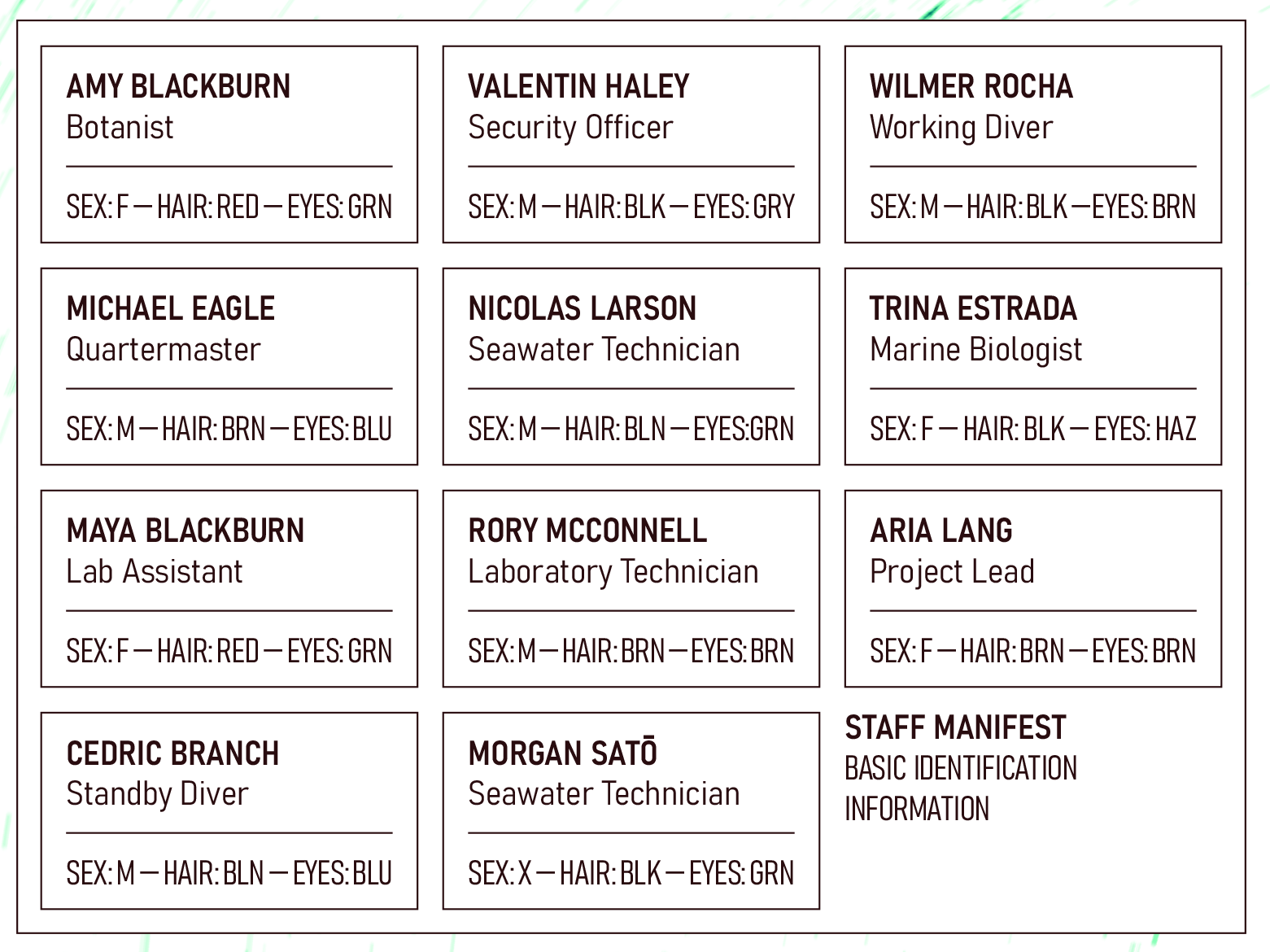 Second, they elevate the generic trope: The corporation doesn’t just want a generic “investigation.” They want the PCs to account for the whereabouts of all station personnel, and the adventure immediately gives the PCs a staff manifest including names, jobs, and descriptions: